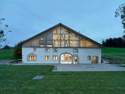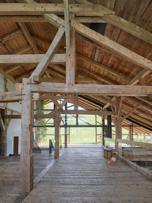 Alle bedeutenden historischen Elemente wurden belassen und sind Teil des Wohnraums. Dies gilt insbesondere für die Scheunenbalken, die im Lauf der Jahrhunderte Patina angenommen haben und nun einen wesentlichen Bestandteil der Innenarchitektur bilden. Der verfügbare Raum und die vorhandenen Materialien wurden sinnvoll eingesetzt, um Zwischenböden und vor allem ein behagliches Wohnklima zu schaffen. Einige Aussenwände sind verschwunden, um grossen Glasflächen Platz zu machen.