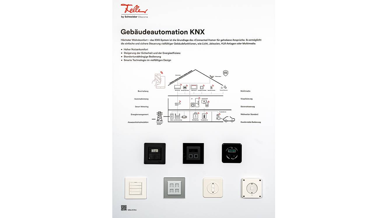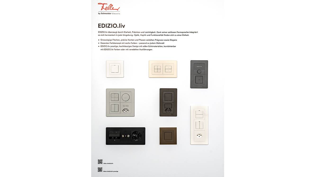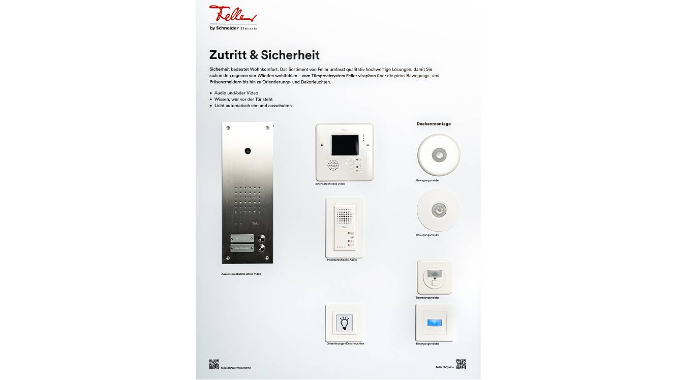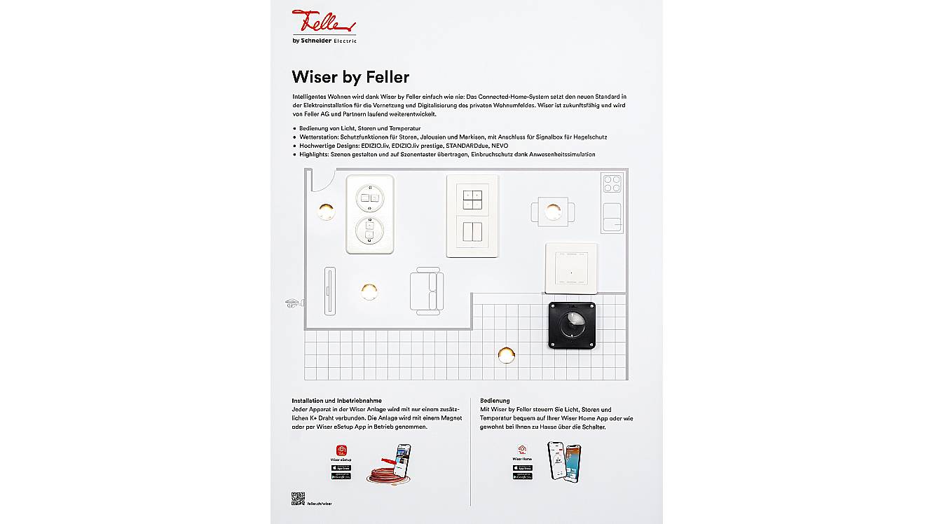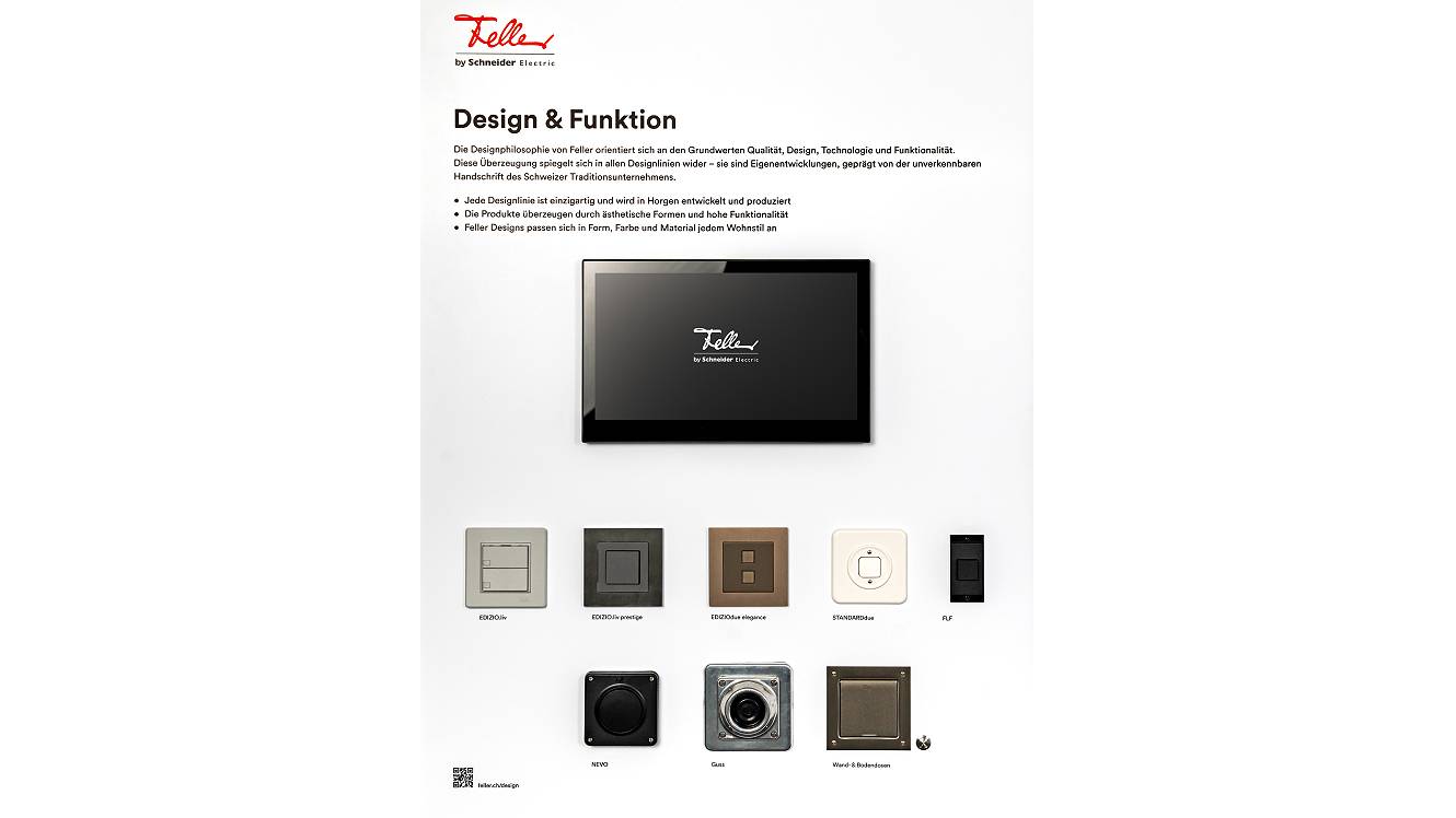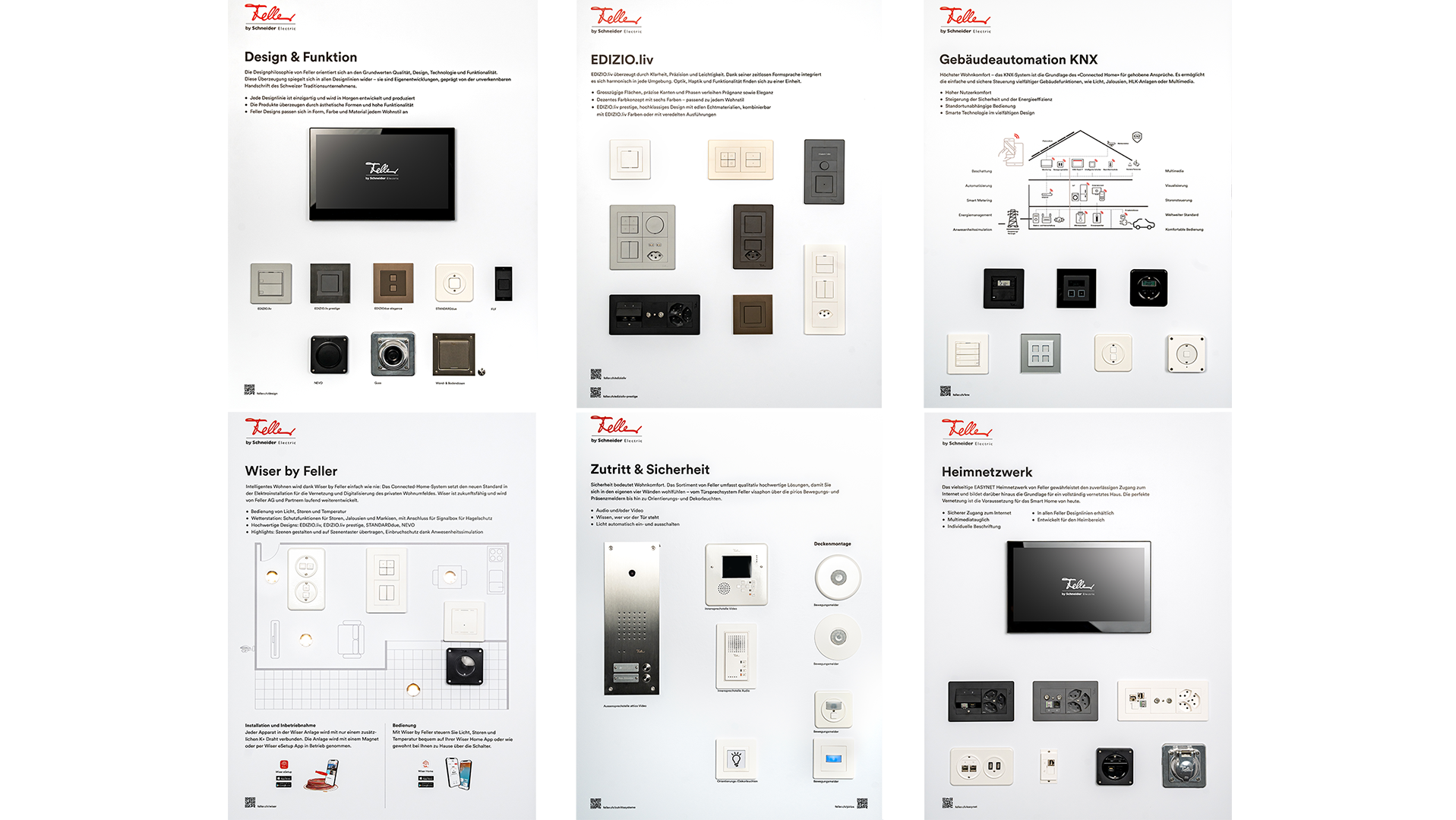 6 Tafeln: Design & Funktion, EDIZIO.liv, Gebäudeautomation KNX, Wiser by Feller, Zutritt & Sicherheit und Heimnetzwerk