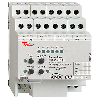 Der Raumaktor steuert elektrische Verbraucher aus drei verschiedenen Gebäudegewerken an. Die ersten vier Relaisausgänge sind entweder auf Jalousiebetrieb (Antriebe für Netzspannung 230 V AC) oder auf Schaltbetrieb (elektrische Verbraucher) einstellbar.