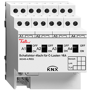 Die Schaltkontakte bei den Schaltaktoren für C-Last 4fach und 8fach sind für Lasten mit kapazitivem Charakter bzw. für bedingt hohe Einschaltströme ausgelegt. Jeder Schaltausgang verfügt über ein separates bistabiles Schaltrelais.