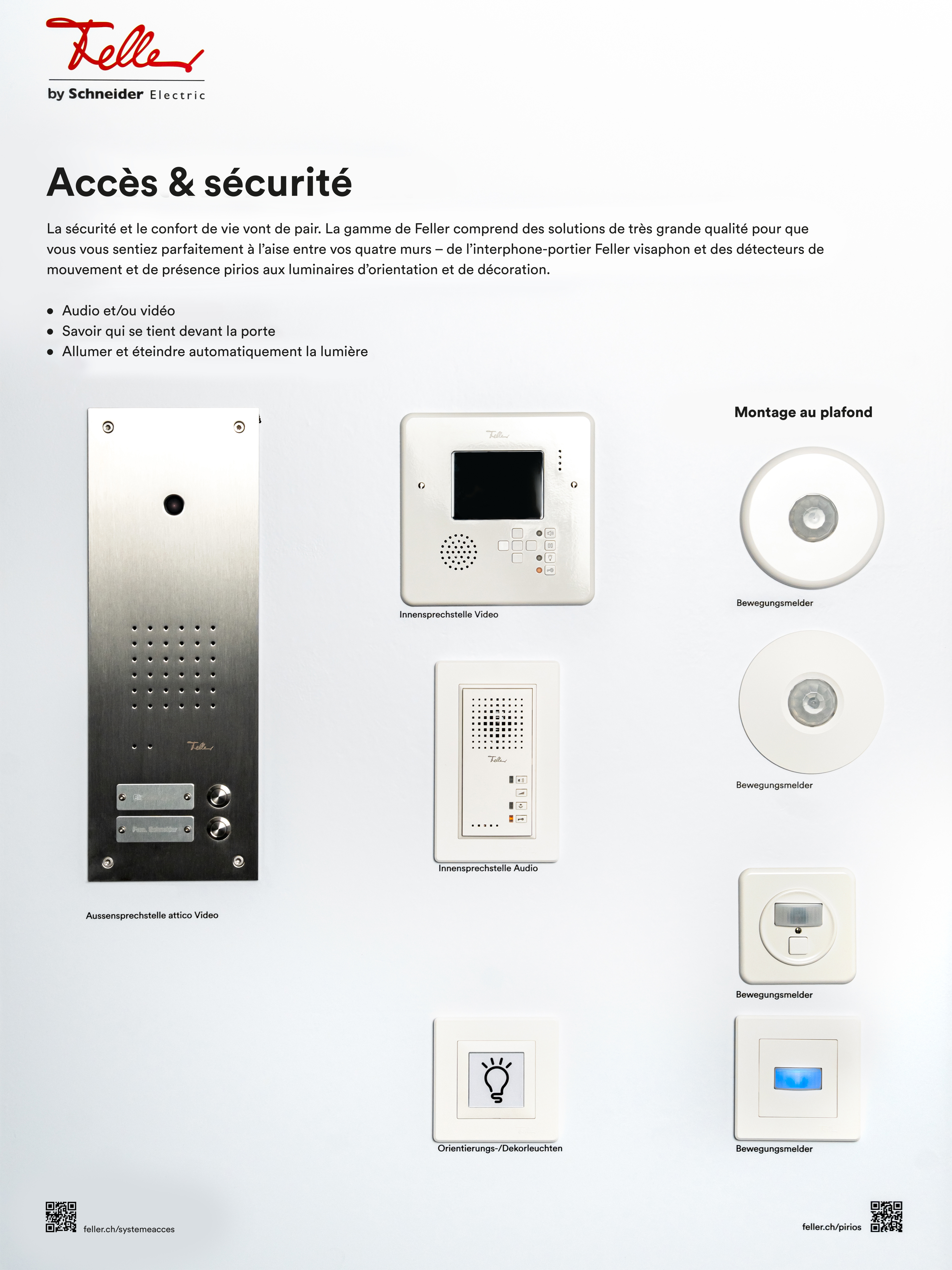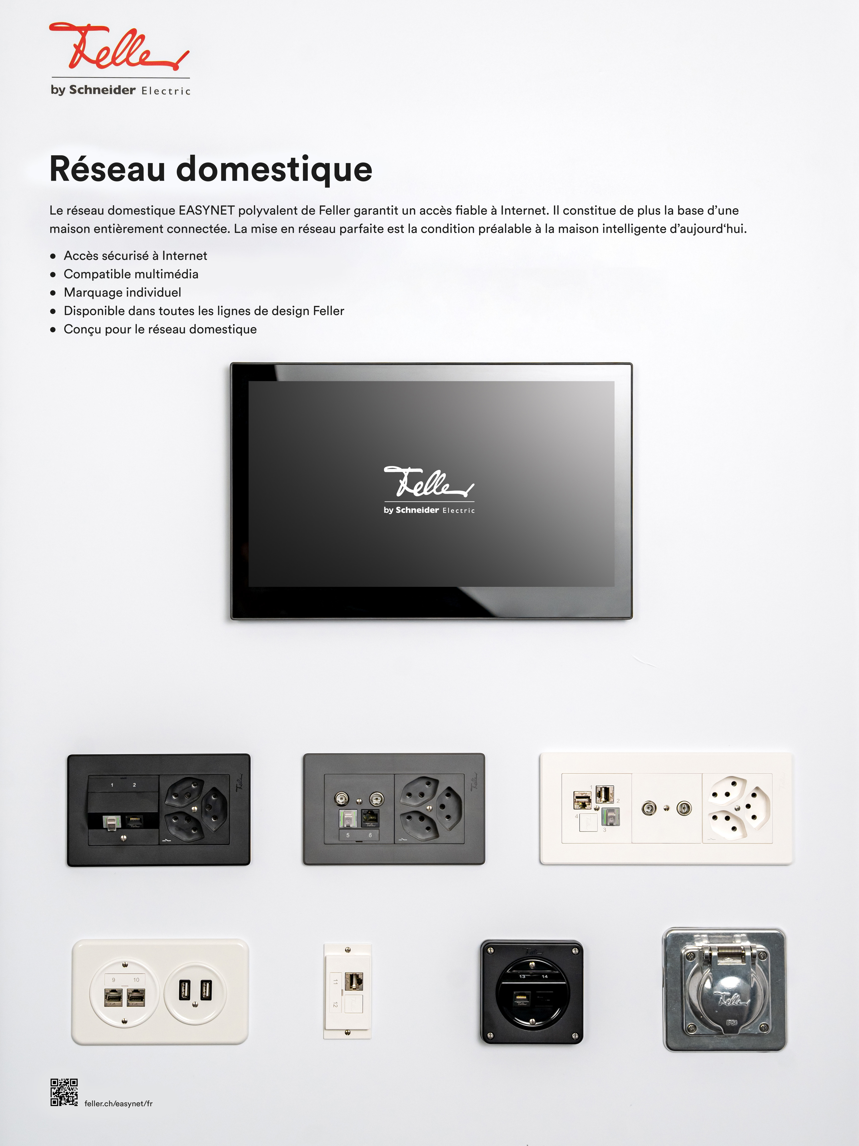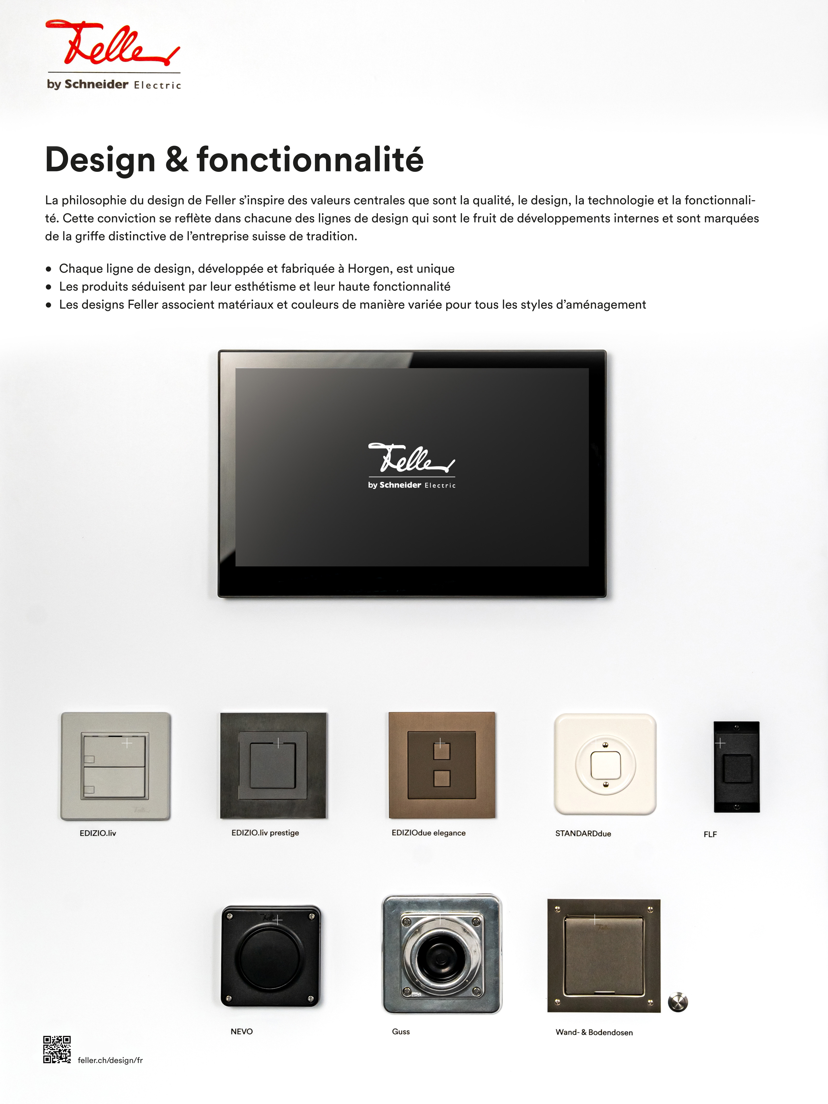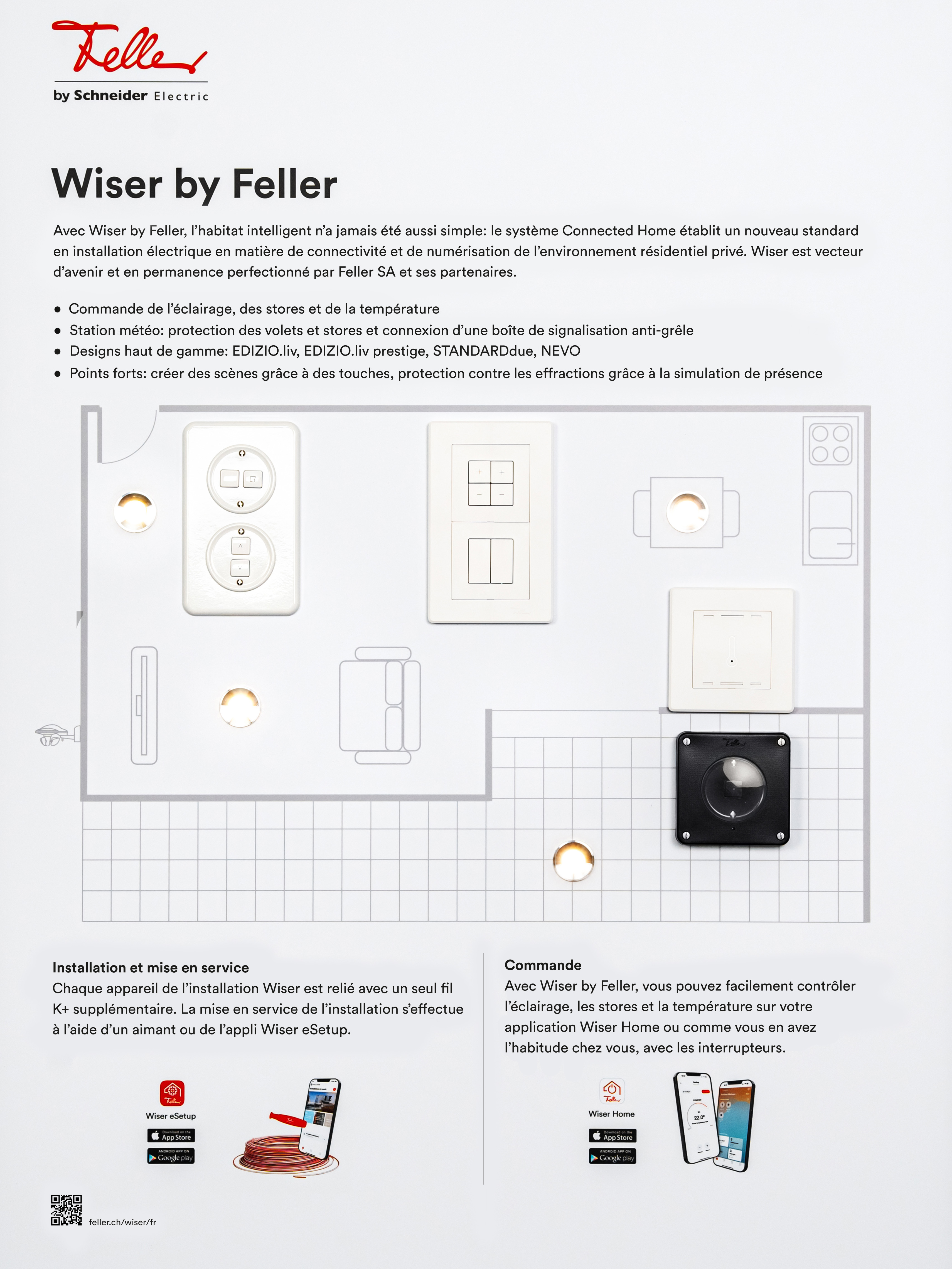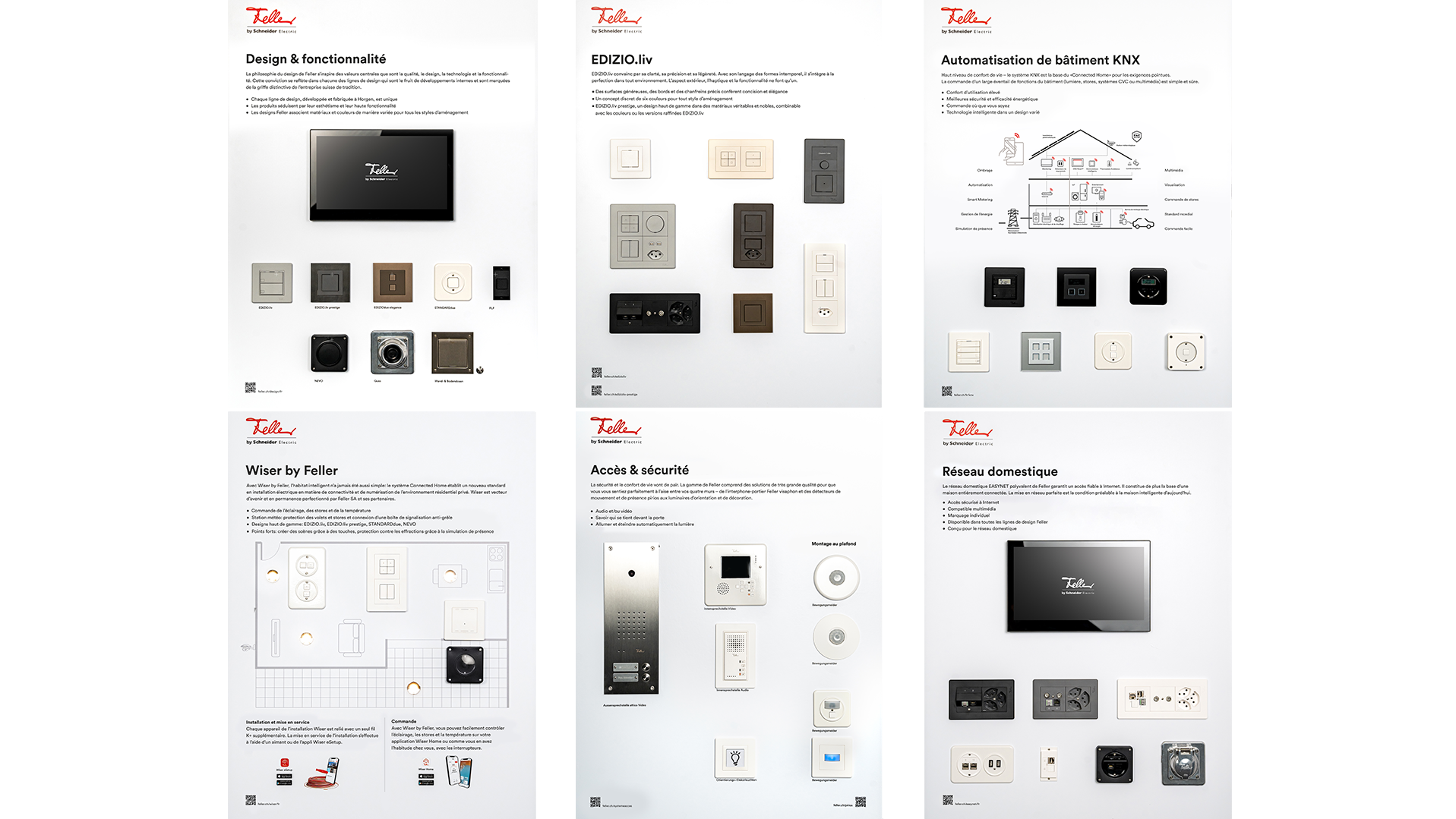 6 panneaux: Design & fonctionnalité, EDIZIO.liv, Automatisation de bâtiment KNX, Wiser by Feller, Accès & sécurité et Réseau domestique